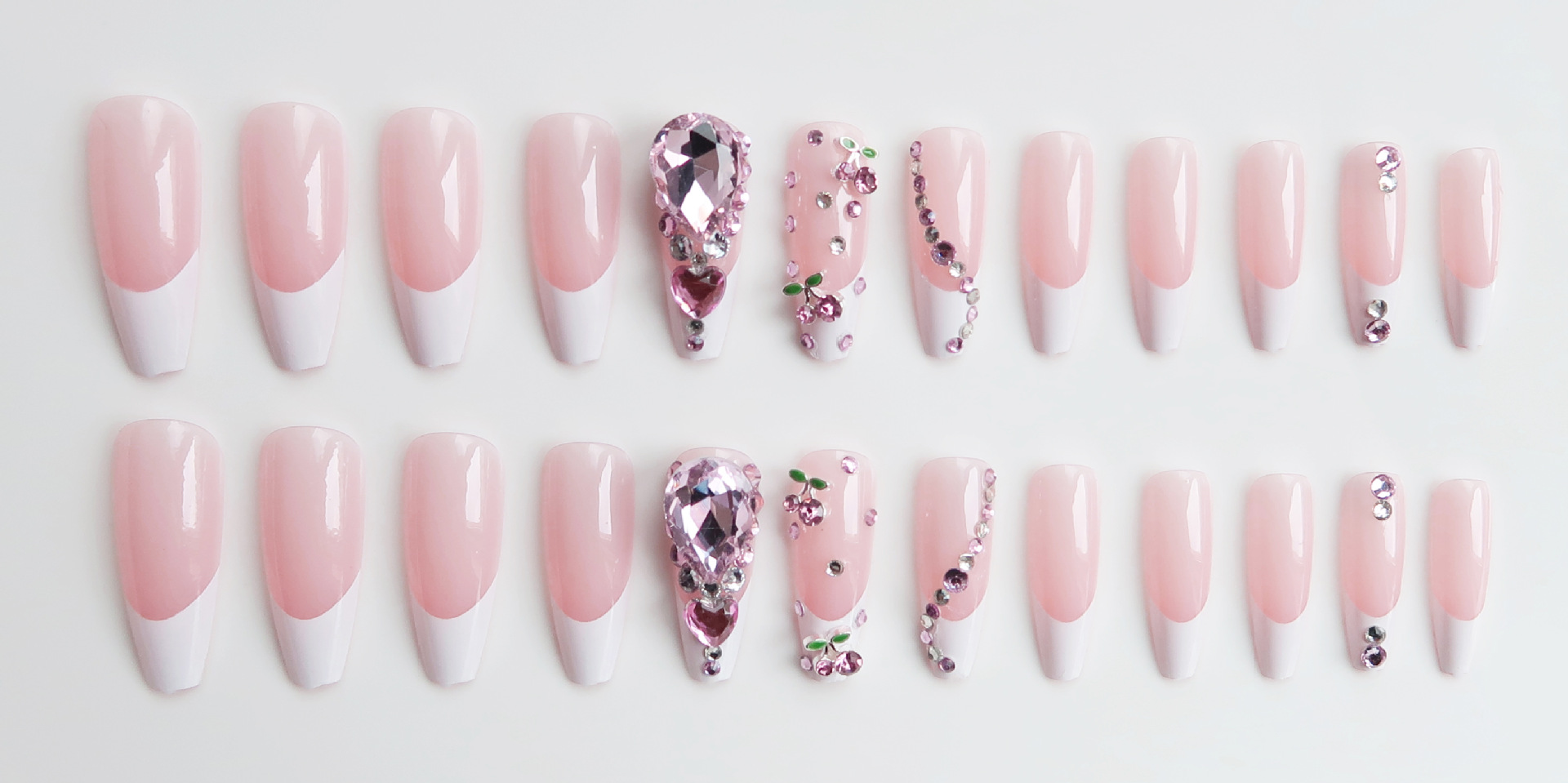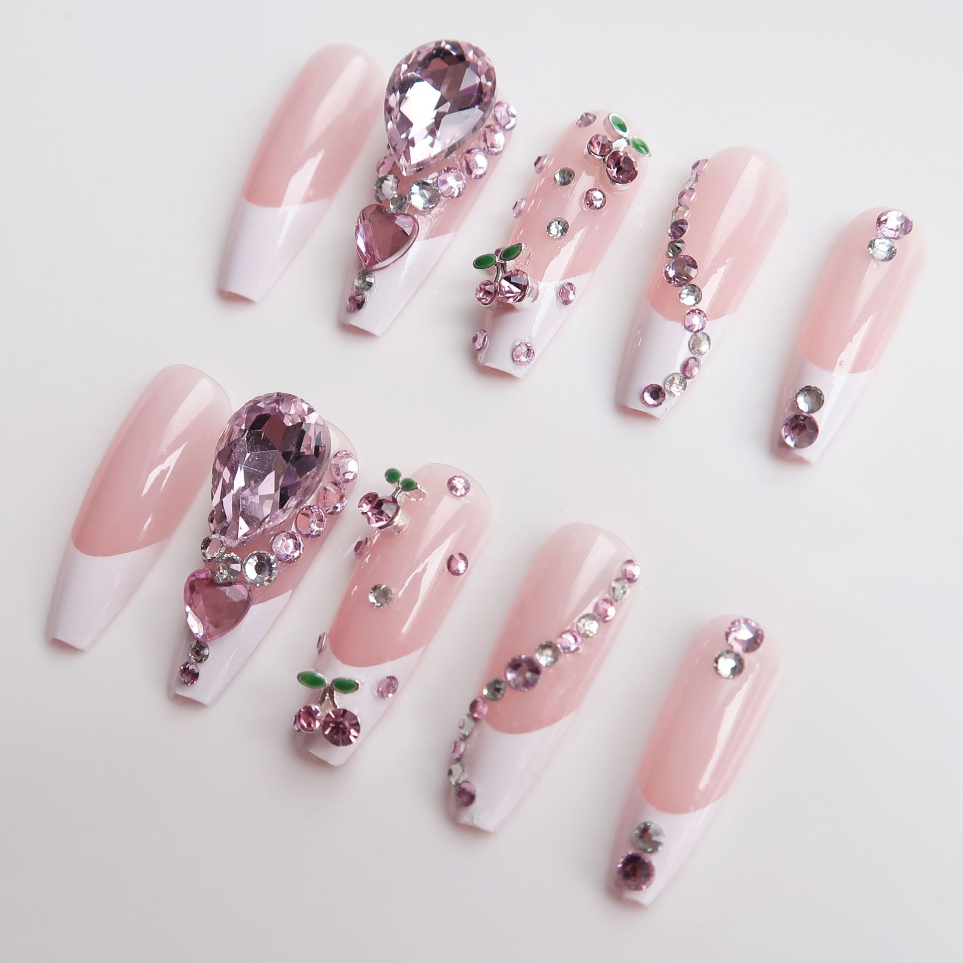 24pcs French rhinstones artifical nails with glue full cover fake nails detachable coffin false nail tips bling press on nails