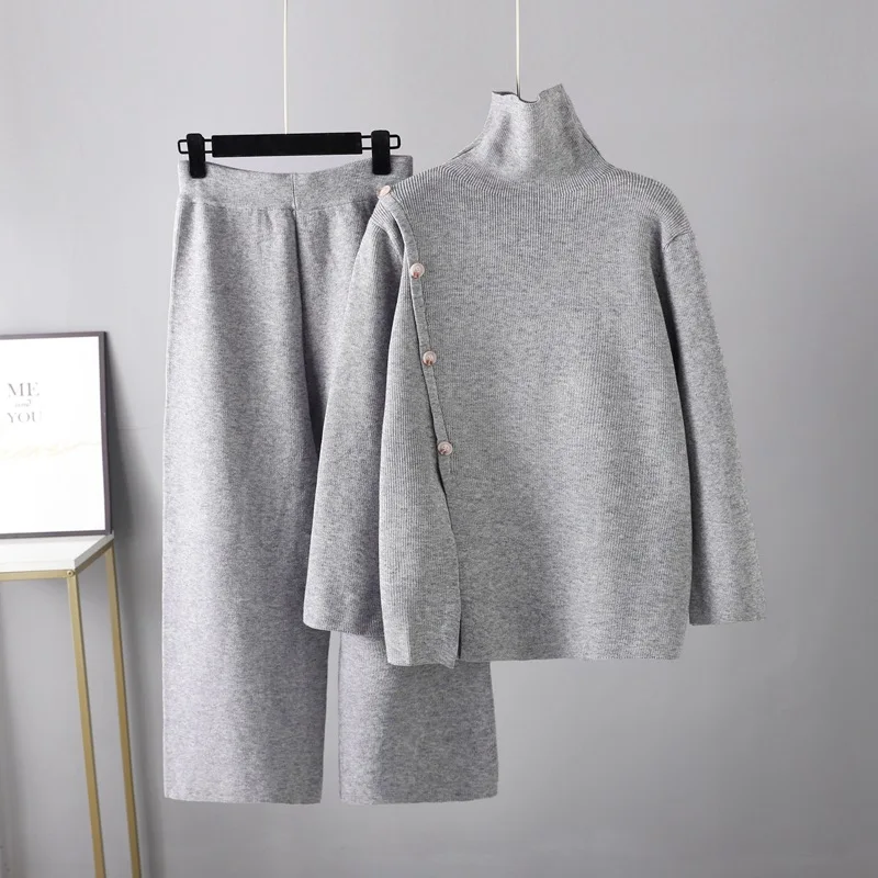 Split Knit High Neck Sweater for Women's Winter Warmth Reduction Casual Wide Leg Pants Two-piece Set