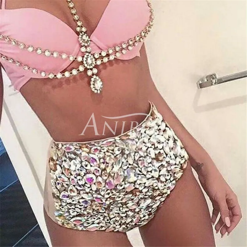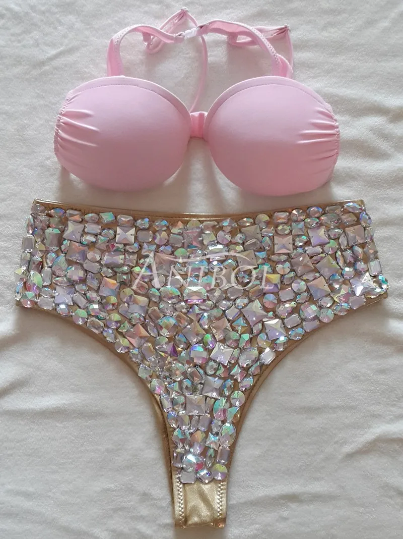 Costume da bagno sexy push up con strass di lusso con diamanti, costume da bagno cucito a mano in cristallo, costumi da bagno estivi da spiaggia, biquini