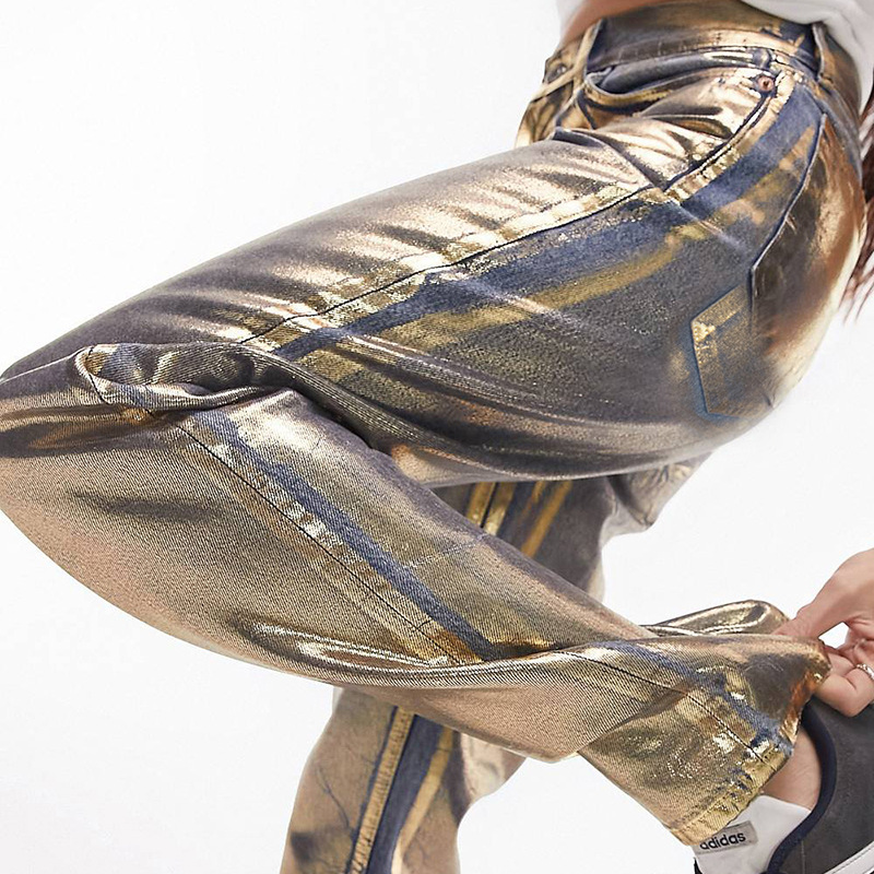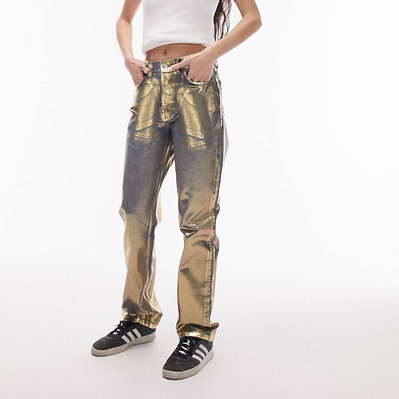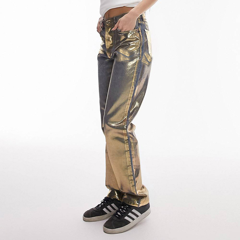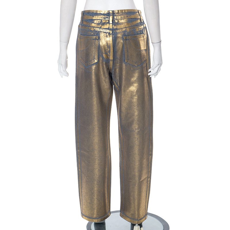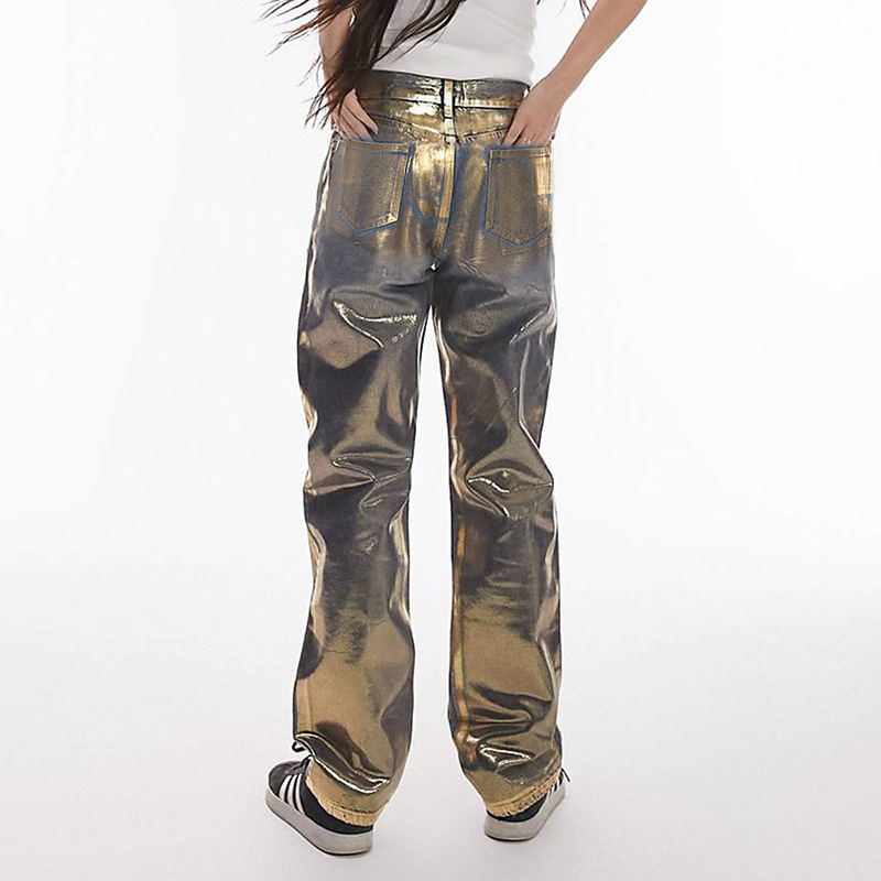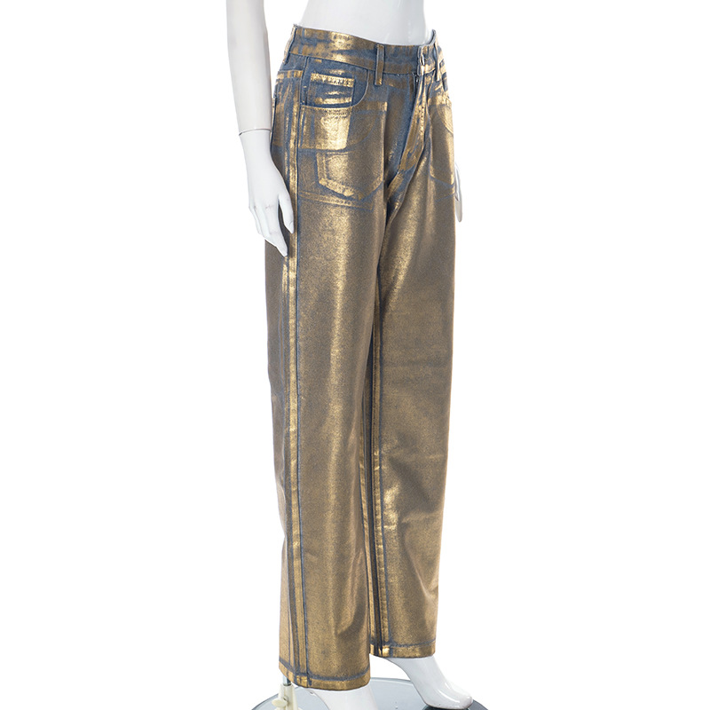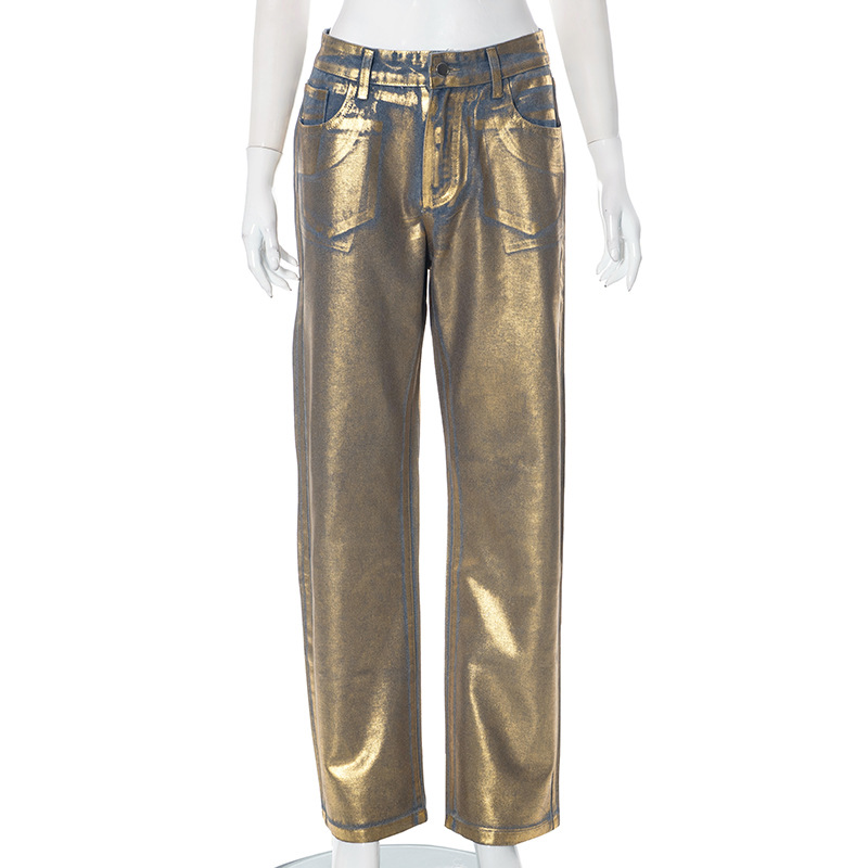 Metallic Gold Silver Straight Leg Jeans High Waist Pants For Women Streetwear Vintage Autumn Y2K Denim Trousers